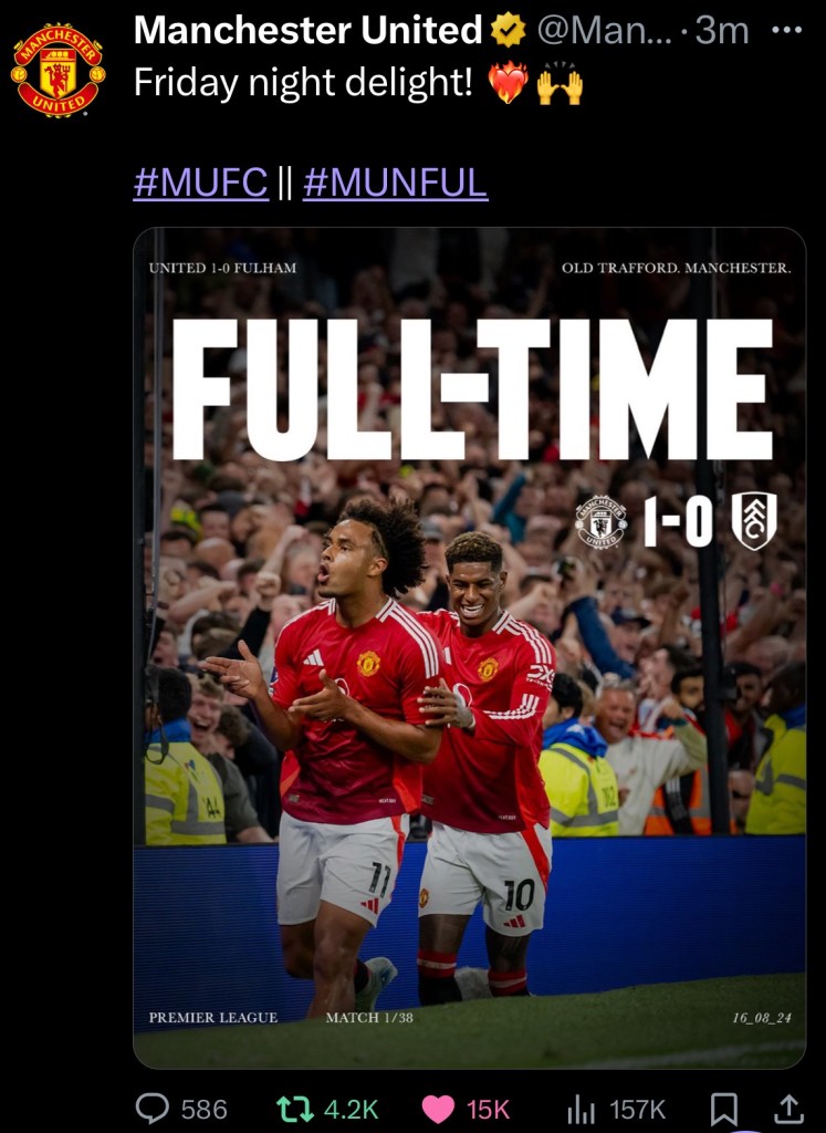 On the heels of a late-winner by debutant Joshua Zirkzee, Manchester United has defeated Fulham 1-Nil at Old Trafford to begin the 2024-25 Premier League season.