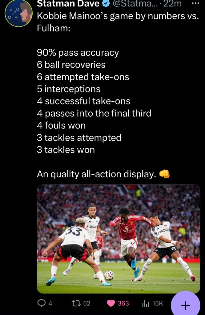 — I thought United was skillful and organized defensively. Anytime they were caught out in transition, UTD was fit and in-the-know enough to stop impending danger. Martinez and Maguire has some impactful tackles and clearances throughout. Onana did what he had to do to keep the ball out of the net. I thought the defensive midfield was stout when it needed to be. Casemiro created both 1H chances. Noussair Mazraoui had a fine debut…92% pass accuracy and 7 passes into the final third, via Statman Dave on X.