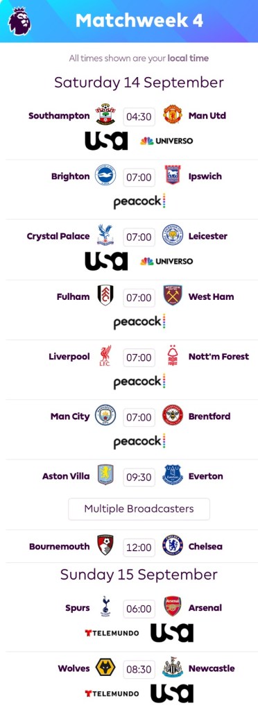 EPL MW4 Fixtures with American TV/Streaming listings in Pacific Standard Time courtesy of http://www.premierleague.com (image edited)