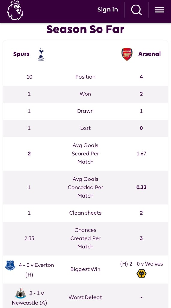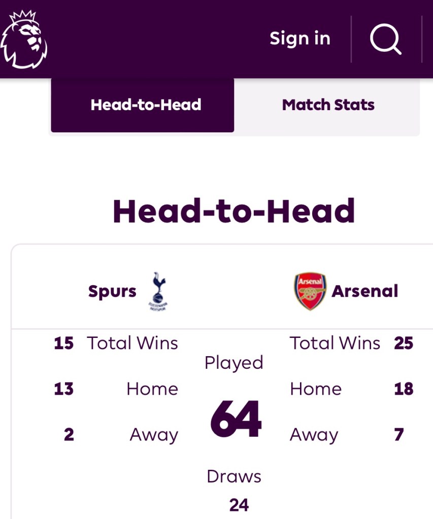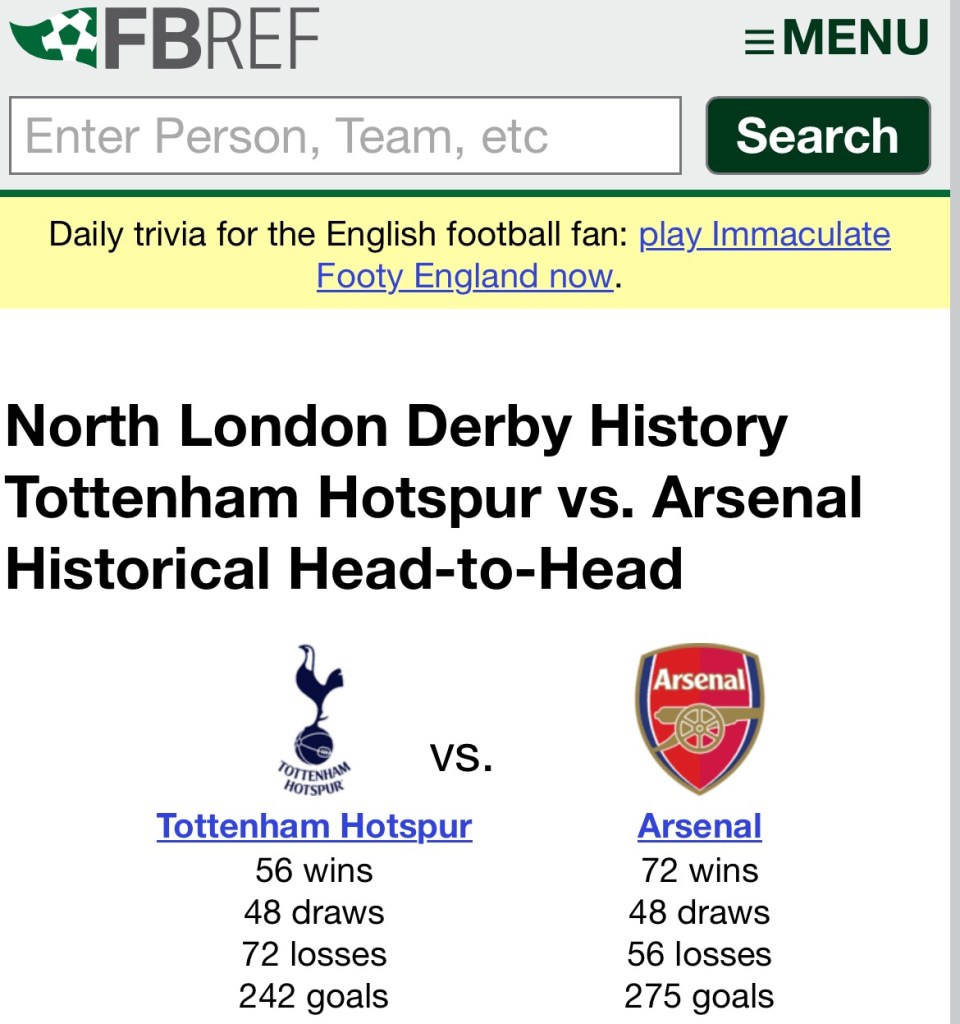 For a comprehensive view of the TOTARS fixture from a historical perspective, go to https://fbref.com/en/stathead/matchup/teams/361ca564/18bb7c10/North-London-Derby-Tottenham-Hotspur-vs-Arsenal-History
