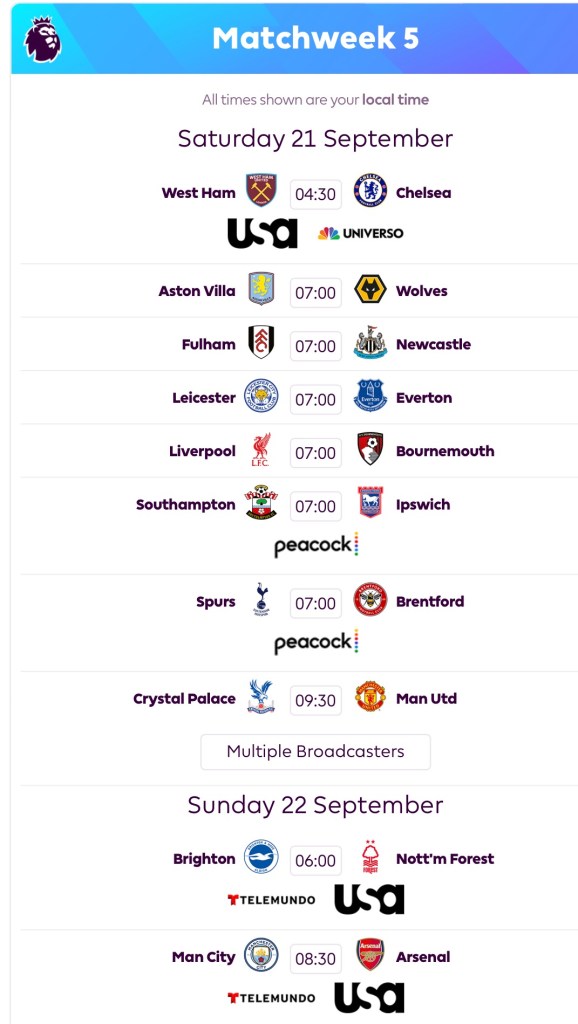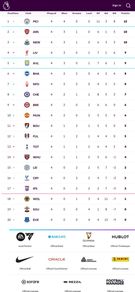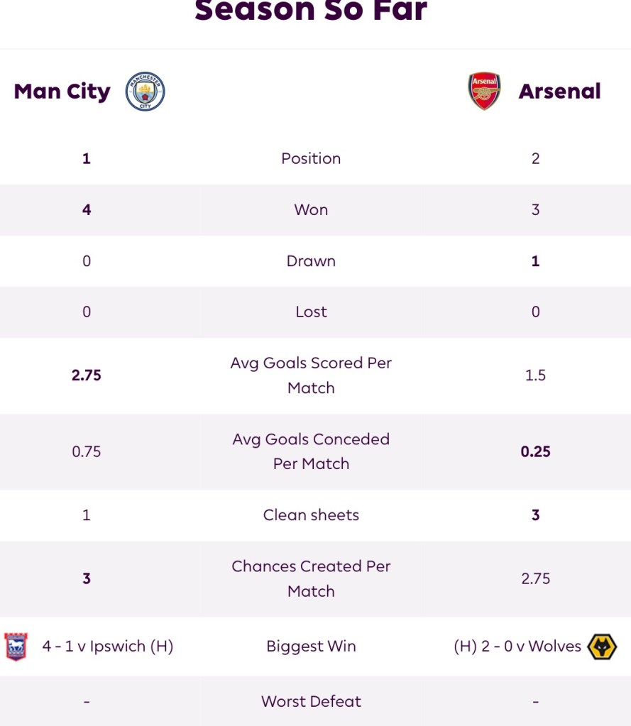 Well it’s pretty straightforward. We all know which MW5 joust receives top-billing this weekend, don’t we. It’s City and Arsenal. The first installment of the head-to-head confrontations between whom many believe are the in-season — in addition to the preseason — league title favorites. MCI comes into the match with four wins in four matches and a competition-best 11 goals scored. ARS sits merely two points behind MCI heading into this early season match and is one of three clubs (MCI, ARS, NEW) to net 10+ goals so far this term.
