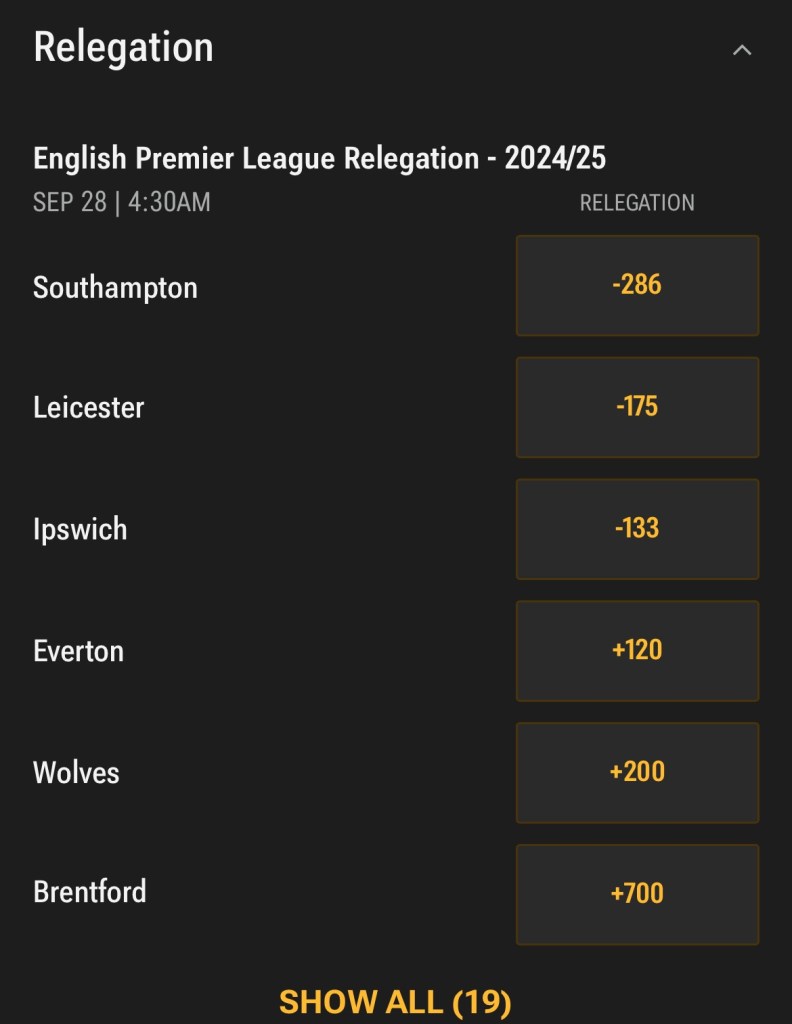 RELATED: The early-term relegation discussion and relevant betting odds via William Hill. (Odds current as of this writing and are informational and entertainment use only, persuant to this writing)