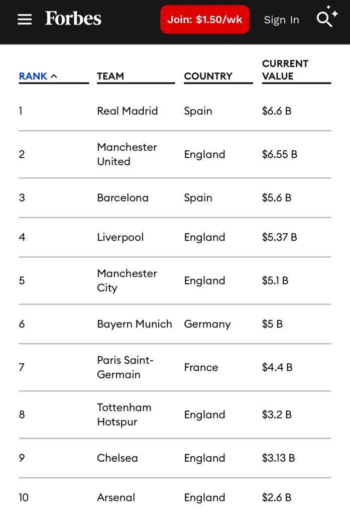 For a comprehensive view of the world’s richest clubs, refer to this work from Forbes: https://www.forbes.com/lists/soccer-valuations/