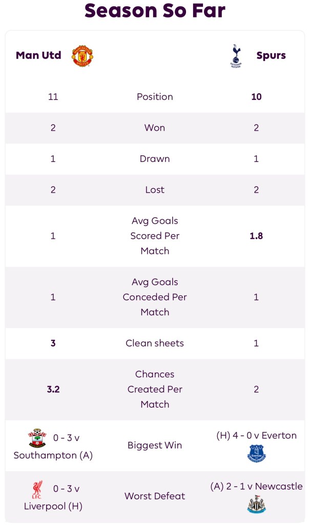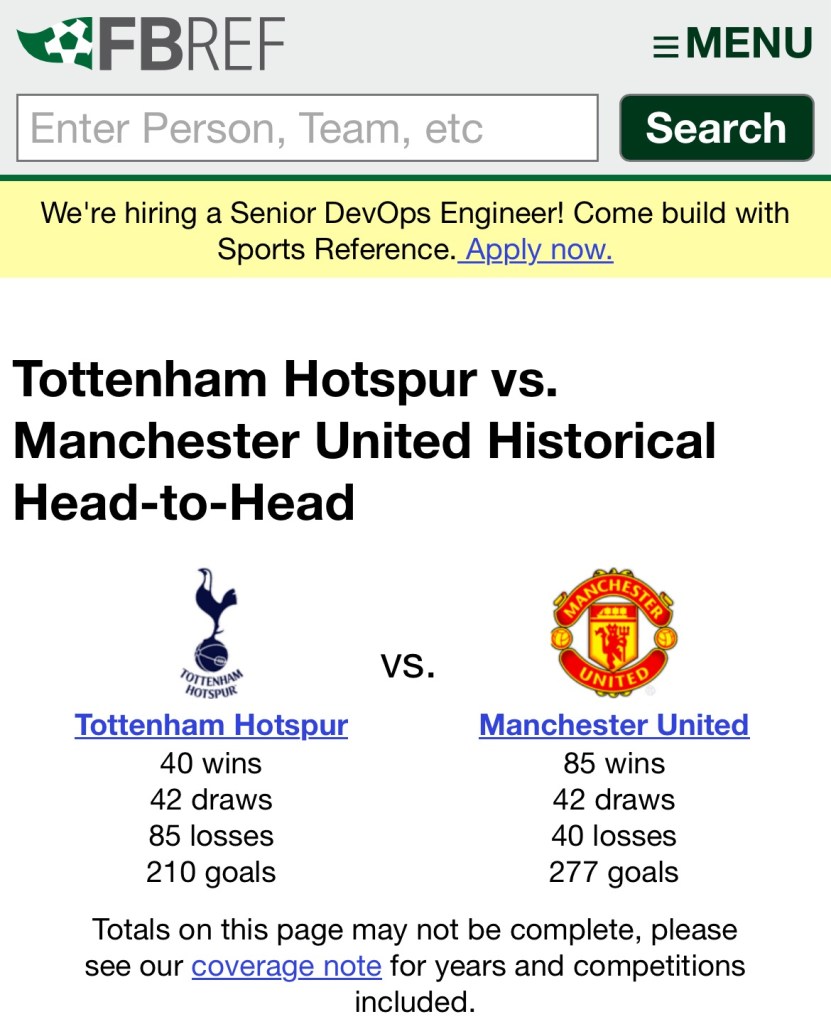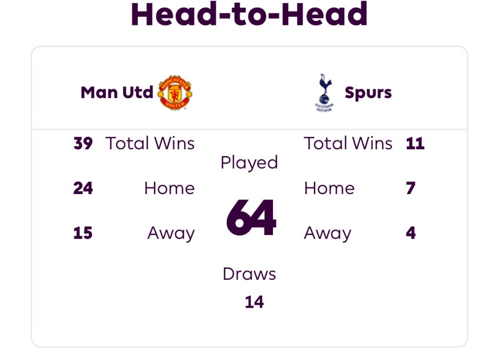 For a detailed summary of the MUNTOT fixture from a historical perspective, go to https://fbref.com/en/stathead/matchup/teams/361ca564/19538871/Tottenham-Hotspur-vs-Manchester-United-History