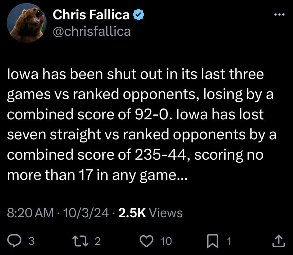 It’s the Buckeyes for me Saturday afternoon in Columbus. I’m not an Iowa Football hater like many in the space are but tOSU is on a different, greater level. This is a comprehensive Buckeye outfit and is, simply, better on both sides of the ball. I can’t see Iowa scoring much — if at all — as tOSU is 2nd nationally in Yards Against, 3rd Yds. Per Play, 4th Rushing Yards Against, 3rd Yds. Per Carry, and 8th Yds. Per Completion. I don’t need to waste your time in saying tOSU is the better offensive football team. I’m comfortable laying up to and including -21.