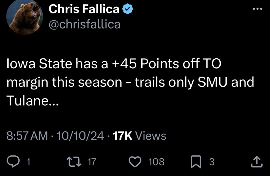 ISU is 4-1 ATS thus far and looks every bit of legitimate. Except in superfluous passing metrics, the Cyclones offense is better than the WVU defense across the board. I really like ISU protects the QB as it ranks 7th nationally in Sacks Allowed. It’s a clean offensive unit, too, ranking 5th nationally in Penalties Per Game (4.0). But it’s the ISU defense you better recognize: 13th and 12th nationally in YPG/A & YDS/PP, 5th in PY/A, 6th CMP%/A and 4th QBR/A. The WVU passing offense is bad…I’m talking near the worst in the country. The ISU defense is 6th nationally in scoring (10.0 PPG) and that defense will be the front page on this victory. I’m good laying the points up to and including four.