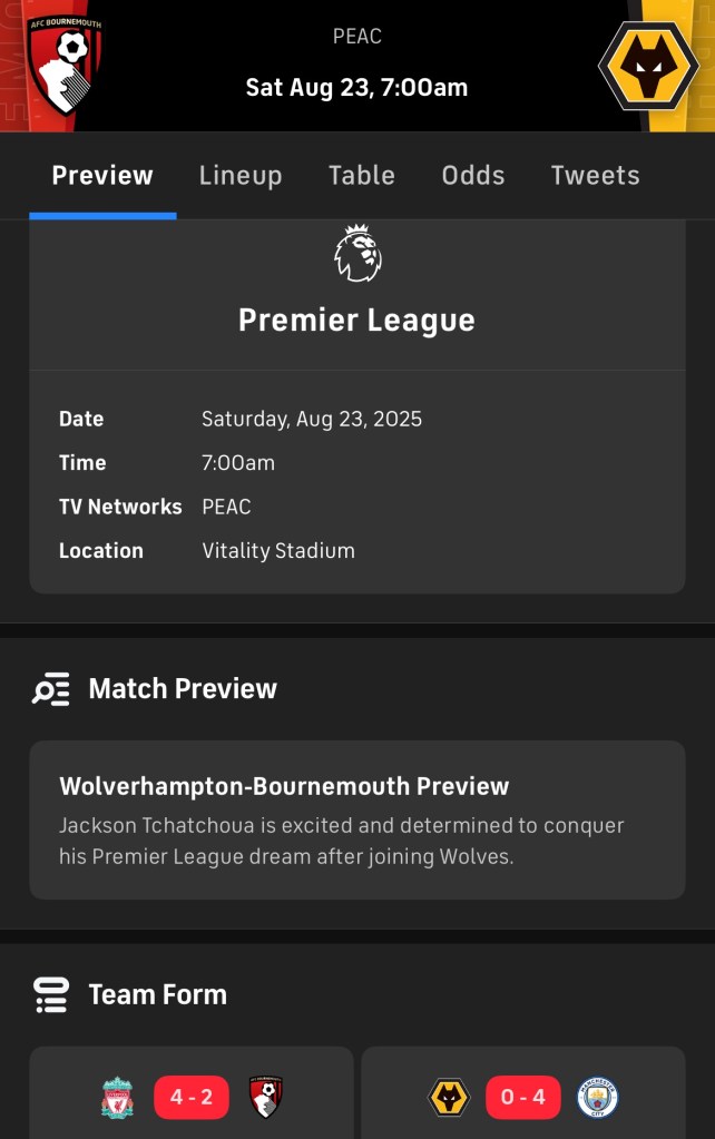 This is a play on the market having on a lower valuation than myself on The Cherries after MW1. The match is at Vitality Stadium in front of the home fans. Maybe just maybe AFCB manager Andoni Iraola runs a tight program there? The Cherries which were ferocious in its comeback at Anfield versus the league champs surely can handle this assignment. Wolverhampton is a relegation candidate as we sit here today. Wolves were domesticated comprehensively in MW1. Granted, Bournemouth isn’t Manchester City and a 4-nil score sheet is probably a whisper of a dream but in the aftermath of that pumping, I just think it’s a big ask to go to the Vitality and expect a result. I can’t get there. It’s AFCB to do the job inside 90+ minutes for me.