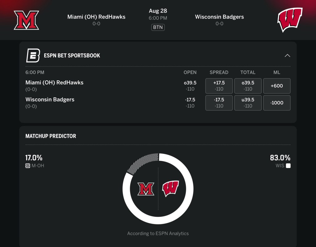 It’s a play on over the total as the Week 1 Top Choice pursuant to The College Football Prologue. I think both new QB’s should find success here. I need to see it from the Wisconsin defense. This unit has really fallen off in recent years. The Redhawks are led by 7th-year QB Dequan Finn, who played at Baylor and Toledo previously. I’m thinking his experience should equate to some level of scoring for M-OH. Here, we have a very manageable number to go over. I’d play it to 40.5.
