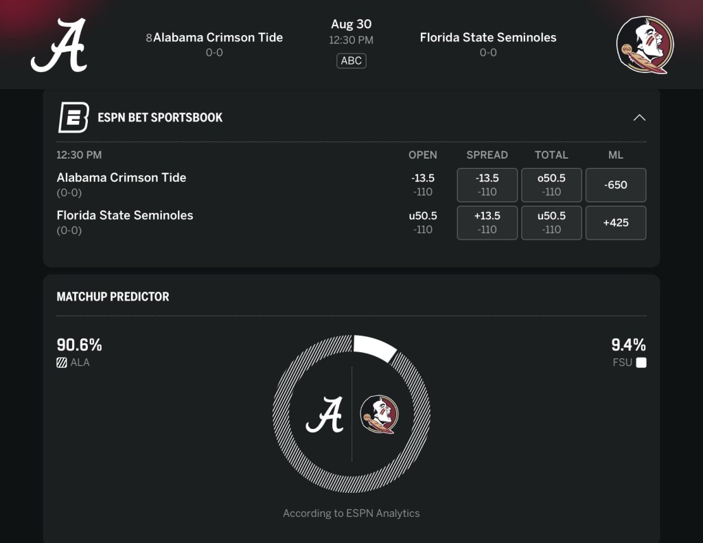 It’s a play on the visiting Alabama Crimson Tide Saturday, laying the points. Lay it, play it. Eye it. Try it. ALA is in a different class than FSU who is coming off a train wreck of a season. I like the new Tide QB and I think ALA is live in the SEC and in the national picture. I’ll need to see vast improvement before I’m reluctant to fade FSU. Should be all Alabama.