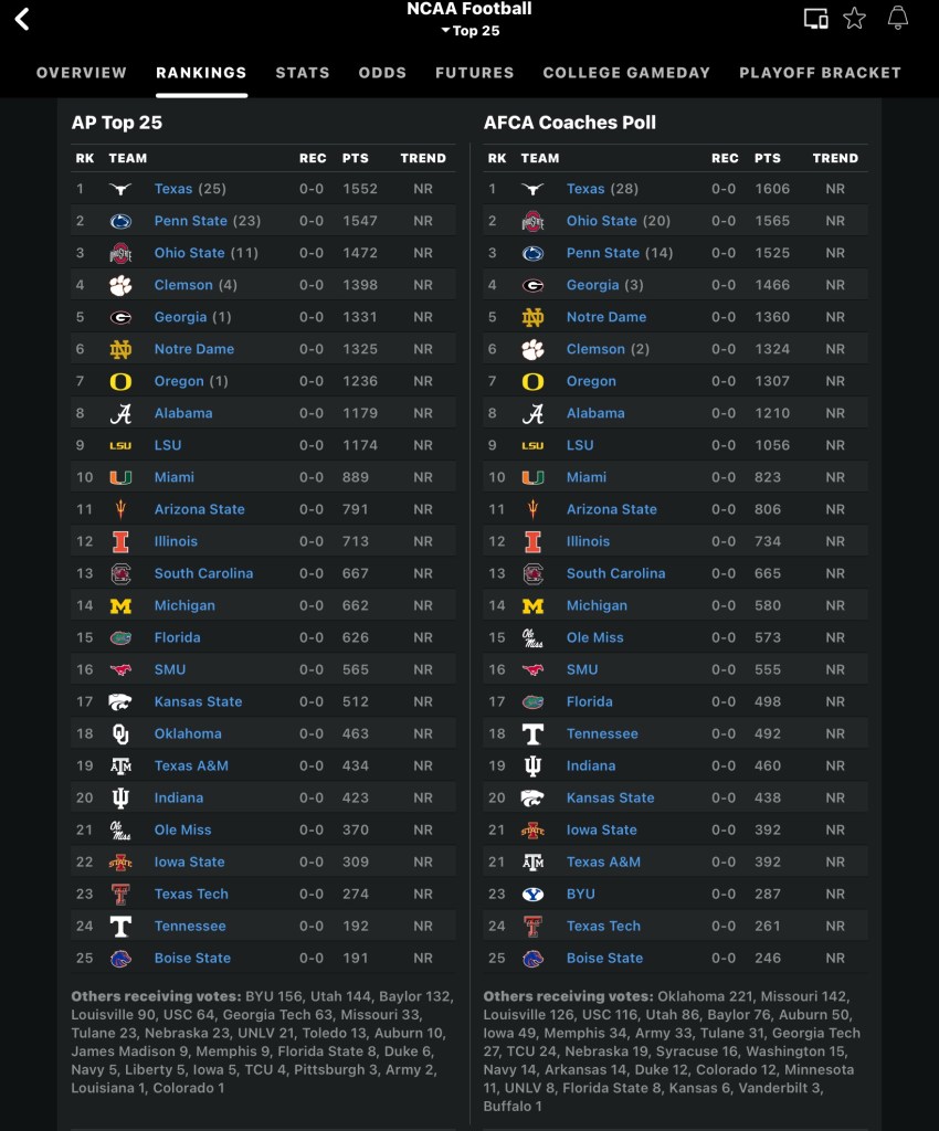 Big year on-deck in Tuscaloosa. It’s play on over 9.5 season wins here. I like Ty Simpson at QB. I like the roster in total. The HC has to have a big year. This schedule is manageable. I like that Texas and Georgia are more ballyhooed. Flying under the radar, I’m expecting a huge season for Alabama. This is a rare occasion where (eagerly) I’ll lay the juice for a few months.