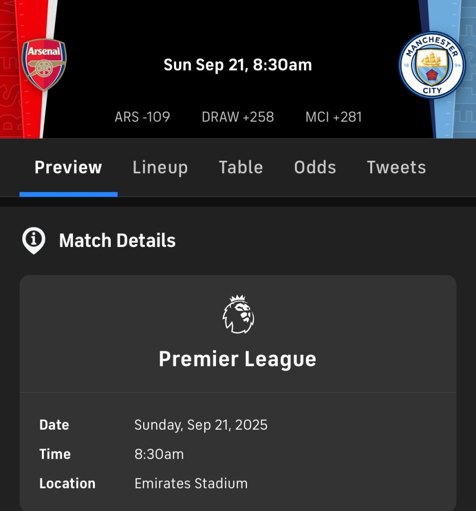 - MCI: Played a UCL joust Thursday and on short turnaround has to go to the Emirates. Bad spot. No thanks.