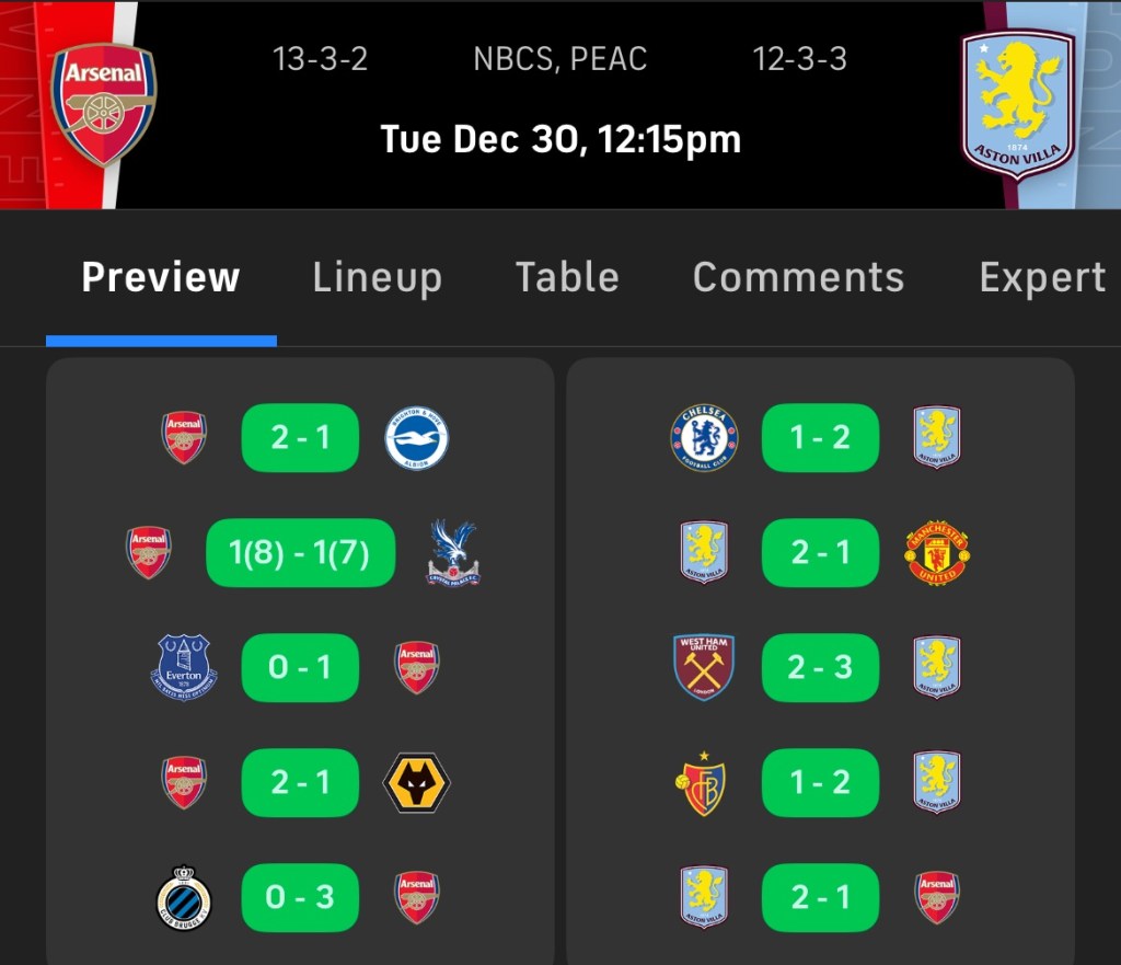 - For me, I just can’t get past the fact AVL is getting by on this huge run yet the metrics don’t reinforce its supremacy. I think regression is due. Just feels like a 2-1, 3-1 Gunners win to me. I acknowledge both defenses are stout — this is obvious with Arsenal. I just don’t think this is a spot for no or low scoring.